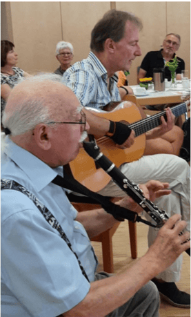 52 Anhänger der Klezmermusik ließen sich von den Virtuosen Leonid Peysakh, Klarinette, und Jürgen Richter, Gitarre und Bass, auf eine musikalische Weltreise der Klezmer-Musik mitnehmen und genossen neben der mitreißenden Musik das reich gedeckte Kuchenbüffet im Pfarrsaal der Katholischen Kirchengemeinde Grafrath. Von der historischen Heimat Russlands, wo an Leonid Peysakh die Kunst des Klezmers vom Vater weitergegeben wurde, schlugen die beiden Solisten eine musikalische Brücke zwischen der jahrhundertalten Tradition und der Moderne von heute. Klassische jiddische Lieder- und Tanzmusik ließ keinen der Gäste ruhig sitzen, Swing und Tangoklassiker weckten alte Erinnerungen an bekannte Melodien. Mit raffinierten Arrangements und energiegeladenen Rhythmen luden die Musiker ihr Publikum zum andächtigen Zuhören ein, wie auch zum rhythmischen Füßewippen. Mit großem Beifall wurden die beiden Solisten gewürdigt. Der Nachmittag klang bei herrlichem Sommerwetter mit einem Glas Wein im angrenzenden Kräutergarten der Gartenfreunde Grafrath e.V. aus.